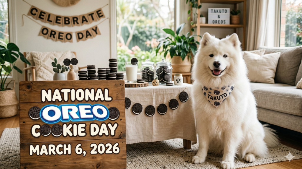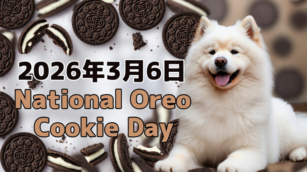 Webサイトなどで画像が表示されない場合や、音声読み上げソフトを利用するユーザー向けの簡潔な説明です。 2026年3月6日の「ナショナル・オレオ・クッキー・デー」を祝うポップな画像。青い背景に、笑顔の白いサモエド犬、山積みのオレオ、ダイナミックに飛び散るミルクが描かれている。 アメリカの記念日