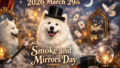 「2026年3月28日Something on a Stick Dayの看板の前に座る、記念バンダナを巻いたサモエド犬タクトと串焼き料理」 美味しい記念日